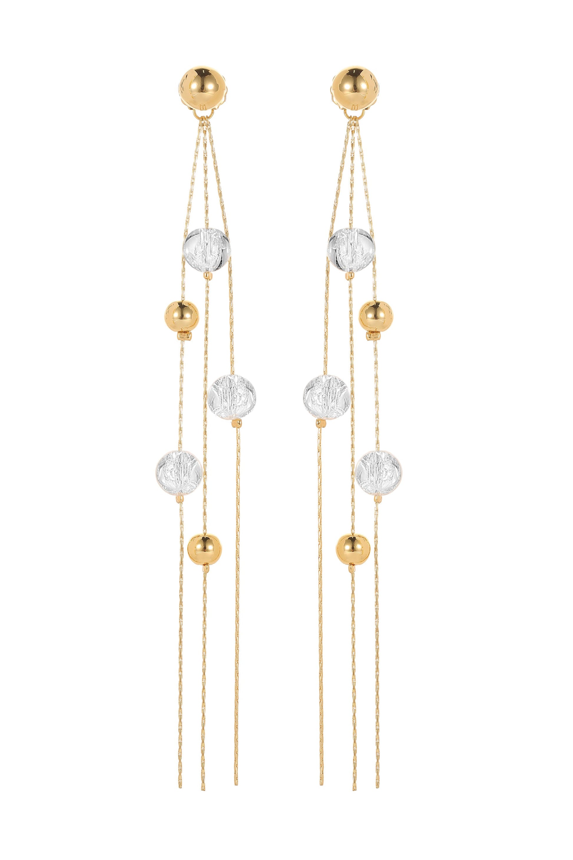 This pair of exquisite drop earrings is a testament to elegance, featuring a perfect blend of luminous gold beads and miniature Azeztulite crystal spheres delicately suspended from a thin gold chain, creating a harmonious fusion of elegance and mystique.