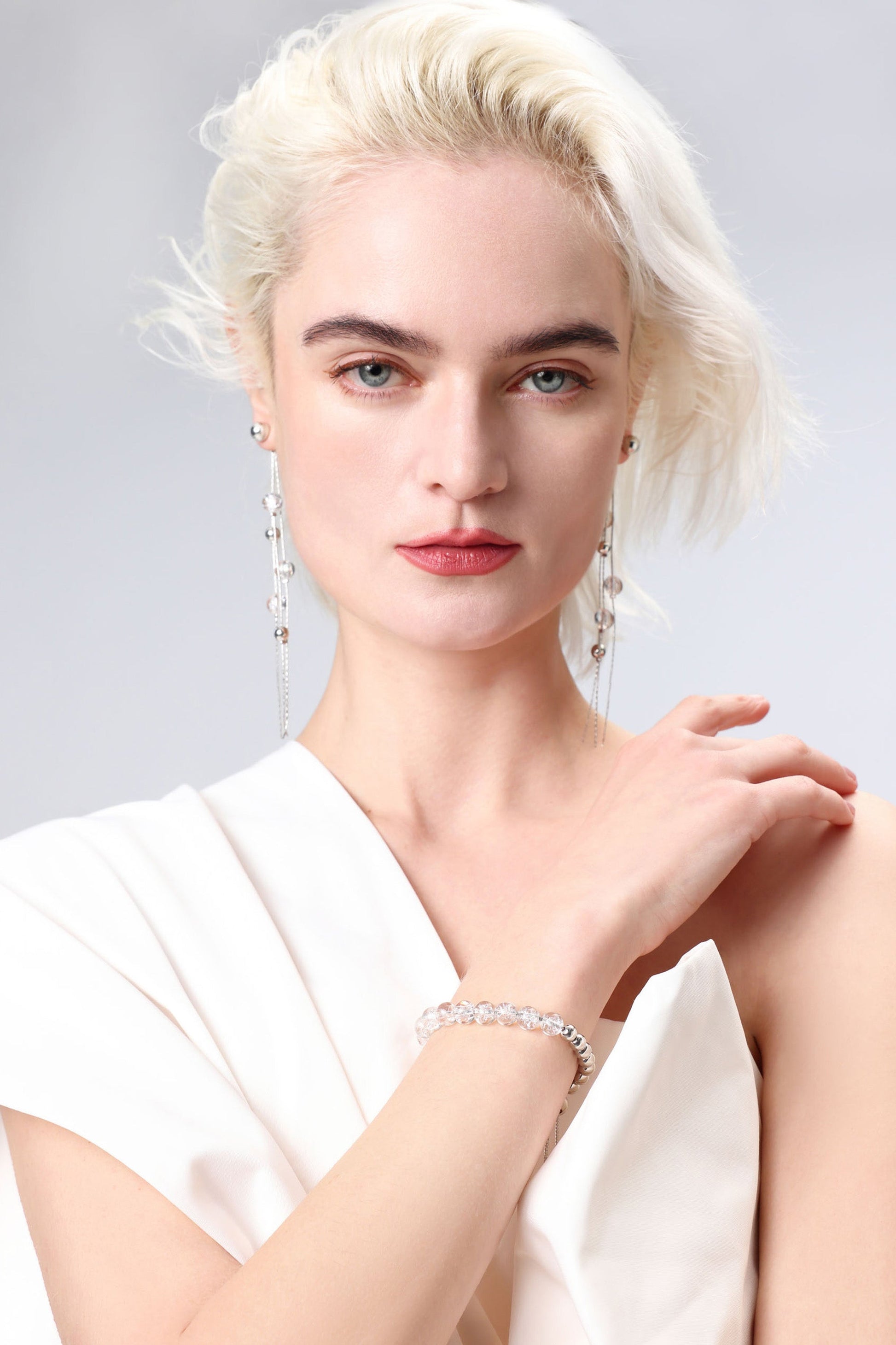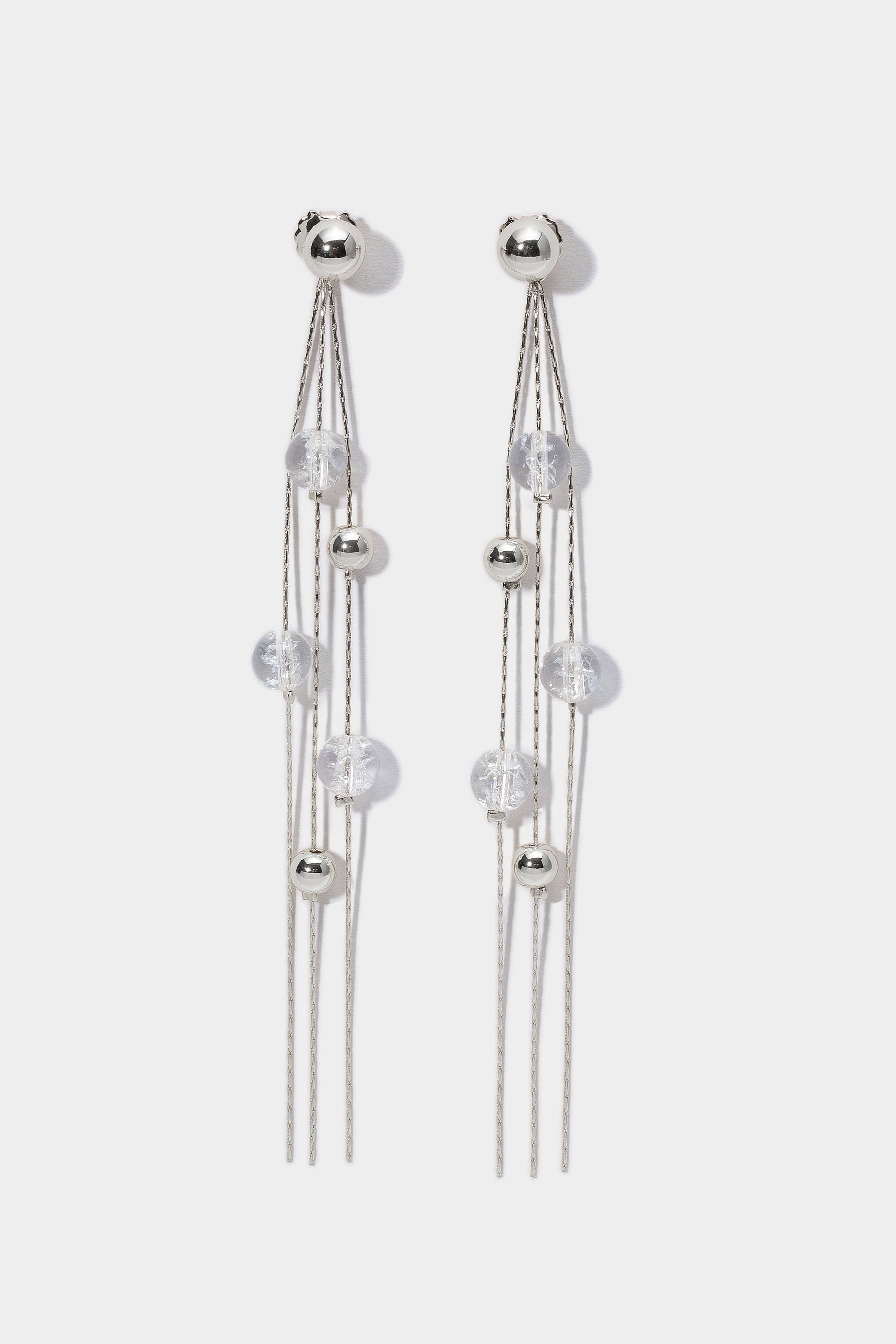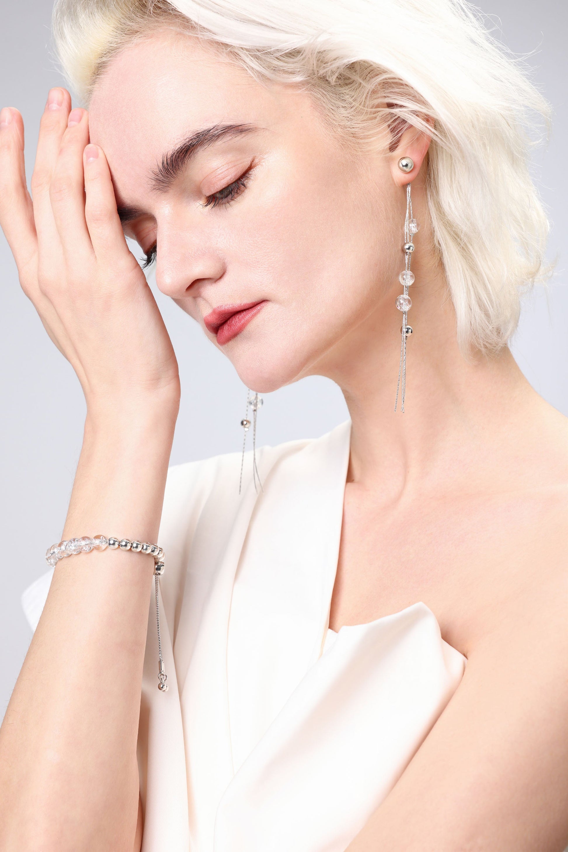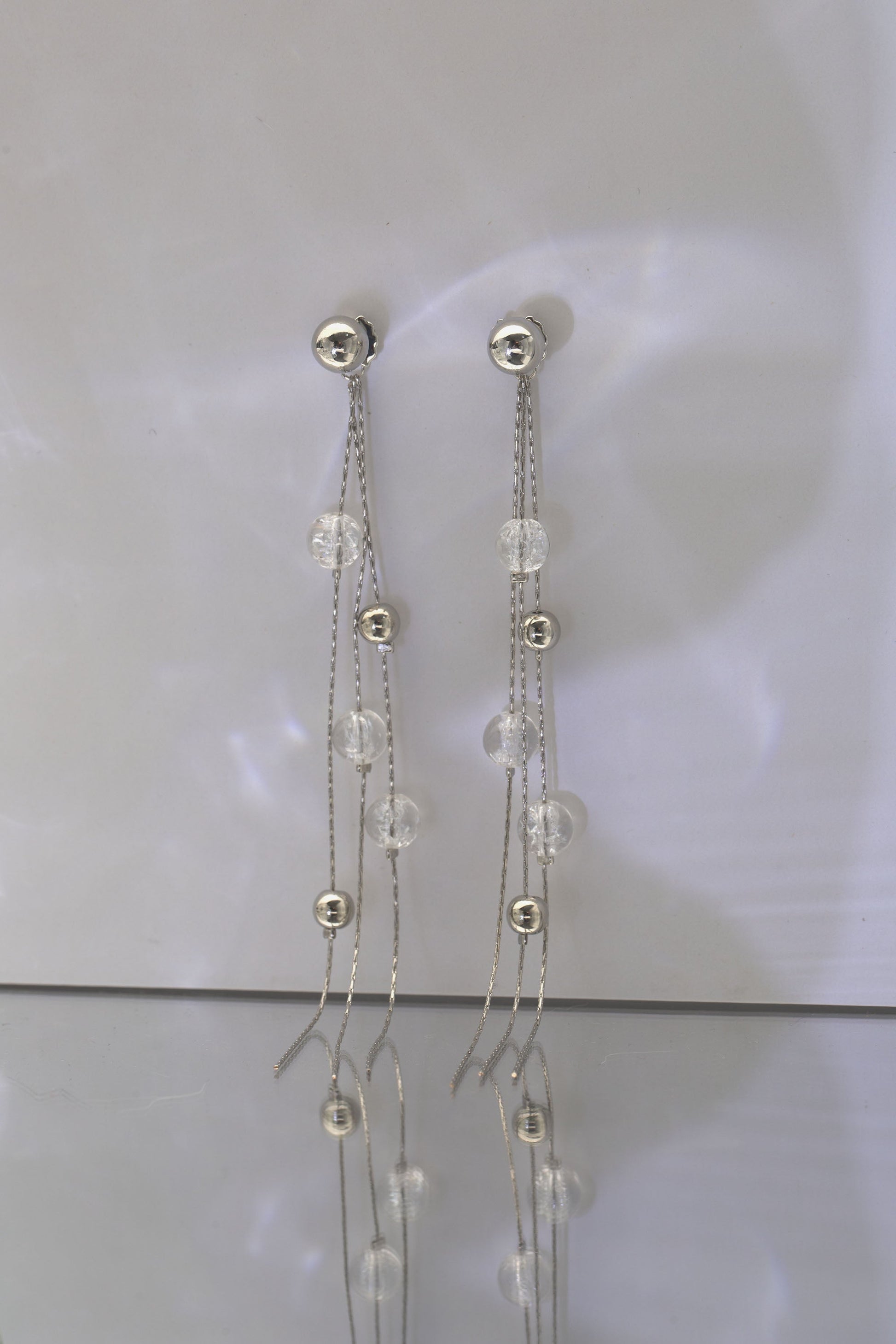 This pair of exquisite drop earrings is a testament to elegance, featuring a perfect blend of sleek silver beads and miniature Azeztulite crystal spheres delicately suspended from a thin silver chain, creating a harmonious fusion of elegance and mystique.