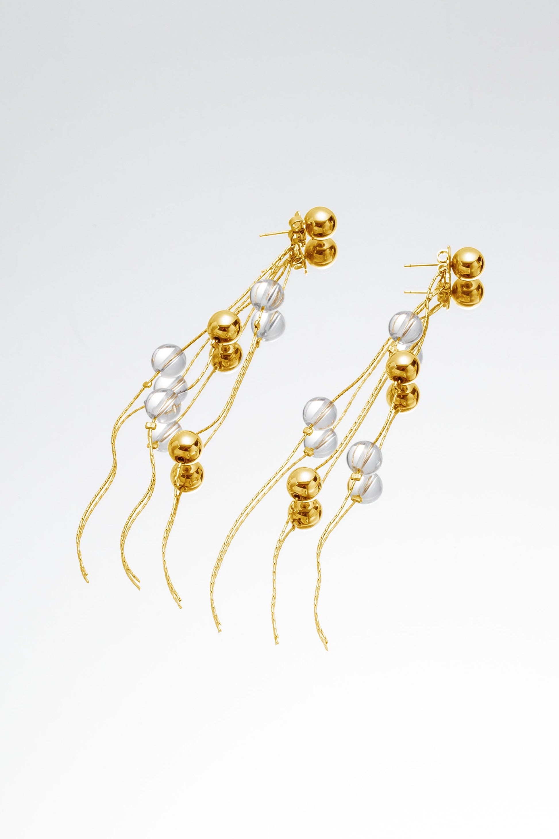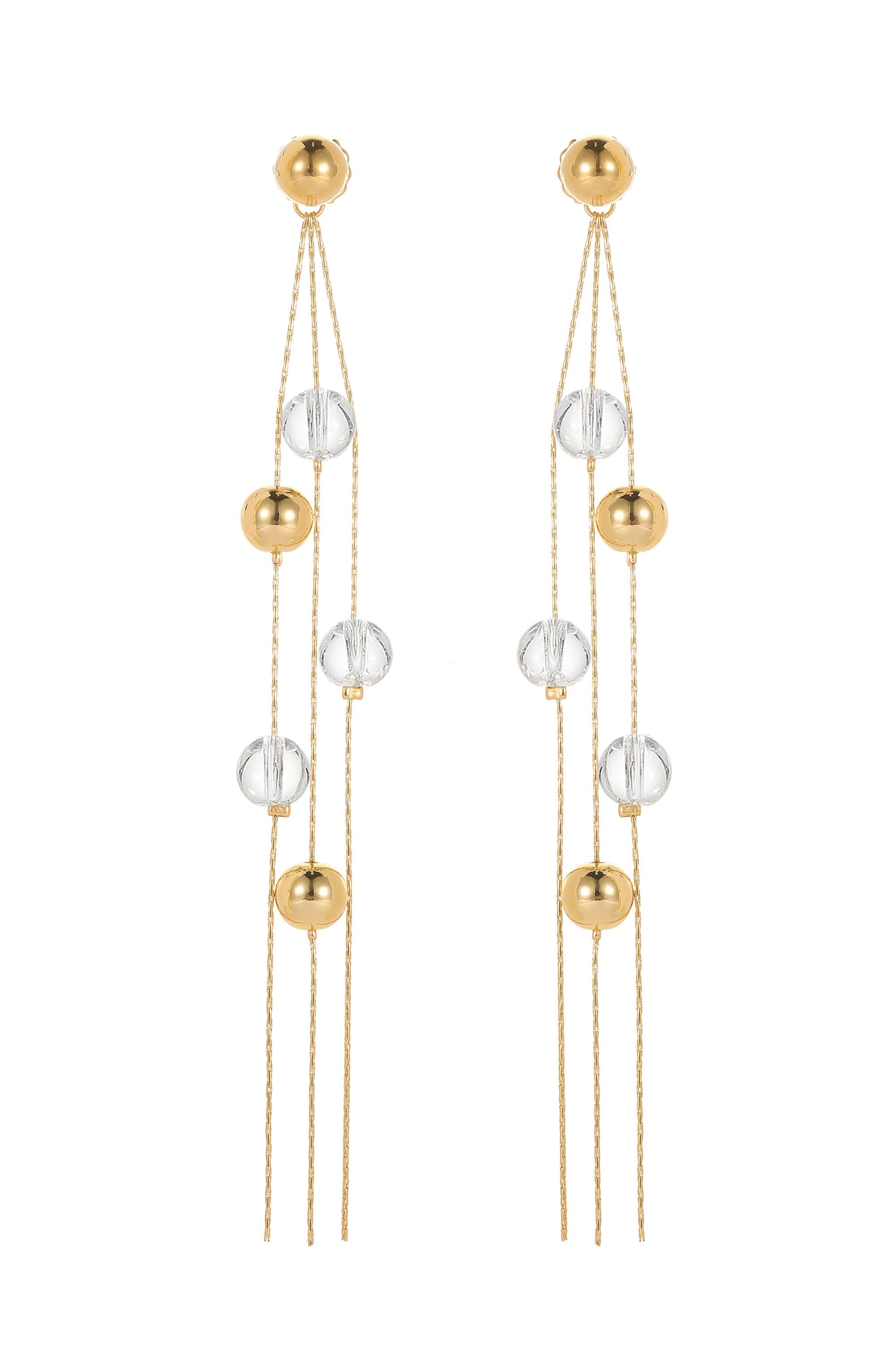 This pair of exquisite drop earrings is a testament to elegance, featuring a perfect blend of luminous gold beads and miniature clear crystal spheres delicately suspended from a thin gold chain, creating a harmonious fusion of elegance and mystique.