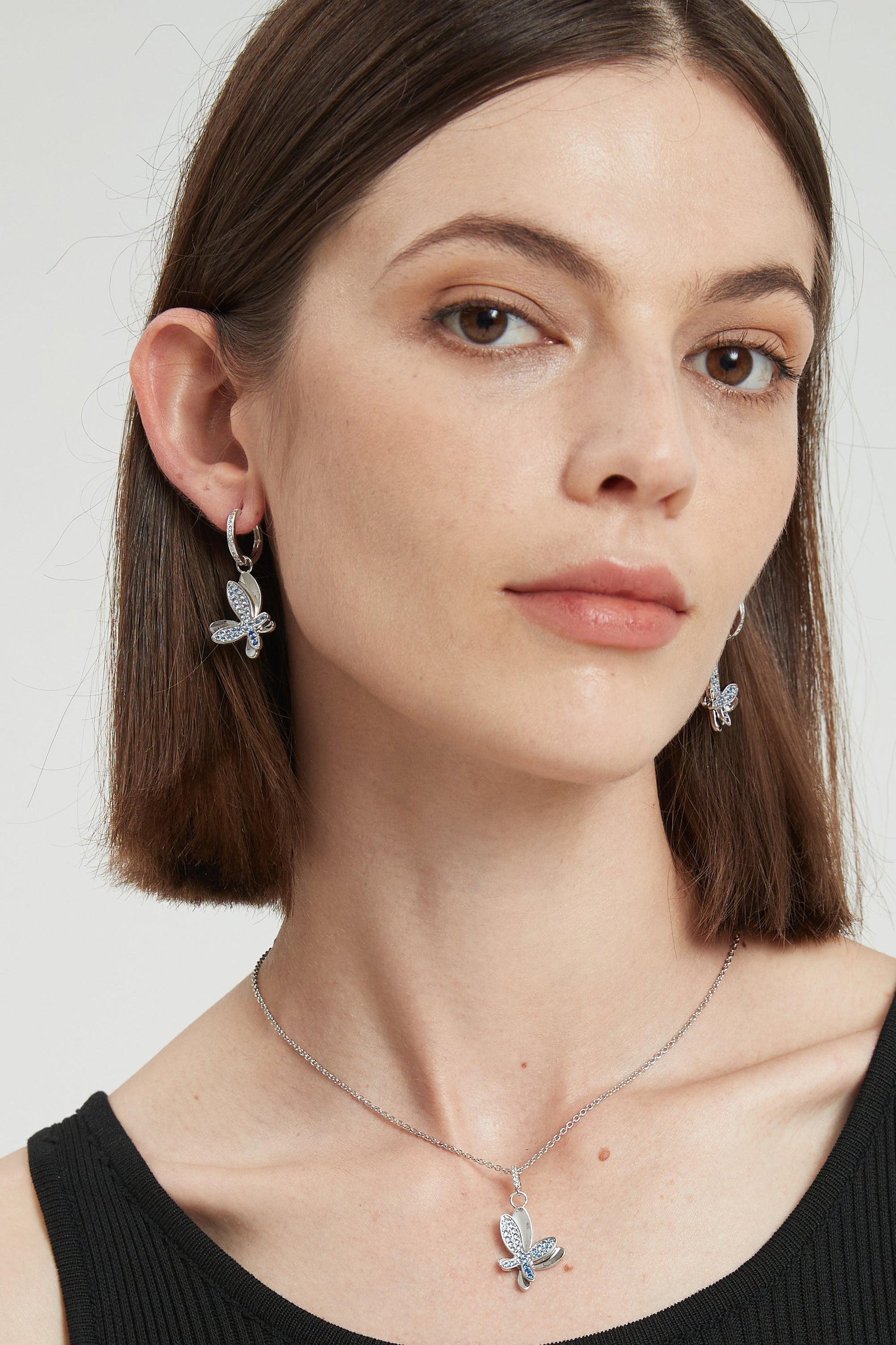 These stunning Pave diamond butterfly dangle hoop earrings are a beautiful addition to any jewelry collection and are available in 4 different colors. The intricate butterfly design sparkles with high-quality diamond-like cubic zircons, creating a look that is both elegant and whimsical. Perfect for adding a touch of glamour to any outfit, these earrings are sure to turn heads. Complete your look with matching necklaces, and pick your favorite color to suit your mood.