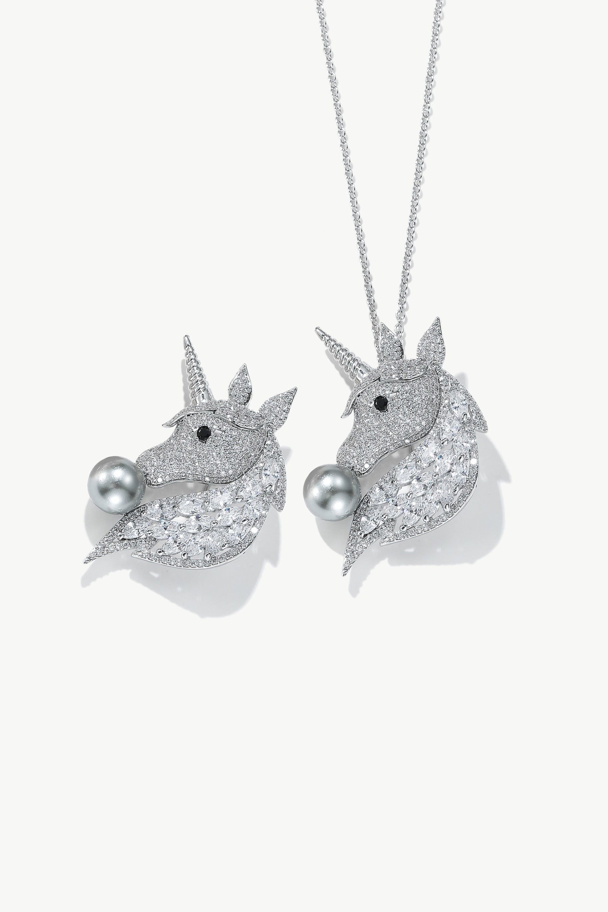 Inspired by the mythical creature, this unicorn brooch symbolizes beauty and freedom that enchants your look with the magical, sparkling crystal-encrusted design. This stunning unicorn brooch is crafted of silver-tone metal embellished with shimmering white Swarovski crystals, zircon stones, and a luminous faux Tahitian pearl. Its crystal and pearl accent offer a shimmering appeal, and its high-finish polish lends itself to a lustrous look. It can be worn as a stylish brooch or a pendant necklace, guaranteed to elevate any outfit. It is also available in gold.